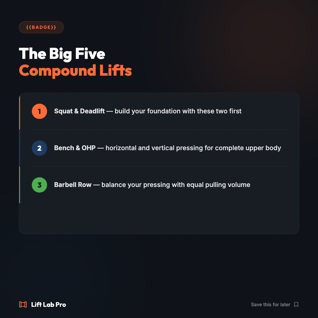 If you only have 45 minutes, spend it on compound movements. Squat, deadlift, bench press, overhead press, and barbell row — these five exercises hit more muscle in less time than any machine circuit. Build your program around them first. #CompoundLifts #StrengthTraining #LiftLabPro #BigFive #PowerLifting #TrainSmart