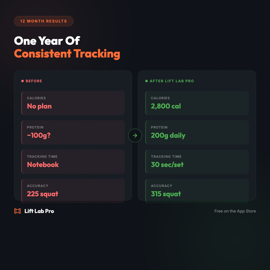 Twelve months of consistent training, tracked meal by meal and rep by rep inside Lift Lab Pro. Down 28 lbs, up 3 plate squat. The app didn't do the work — but it made sure every session counted toward the goal. #TransformationTuesday #LiftLabPro #RealResults #FitnessJourney #BeforeAndAfter #TrackEverything