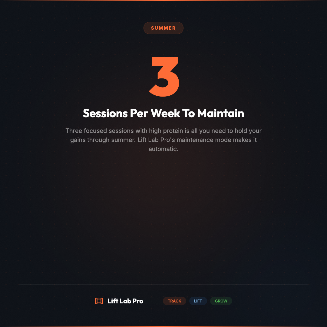 Summer doesn't have to mean giving up your gains. Maintain your strength with three focused sessions a week, keep protein high, and use Lift Lab Pro's maintenance mode. Strong looks good all year. #SummerStrong #MaintenanceMode #LiftLabPro #TrainAllYear #FitnessLifestyle #StayStrong