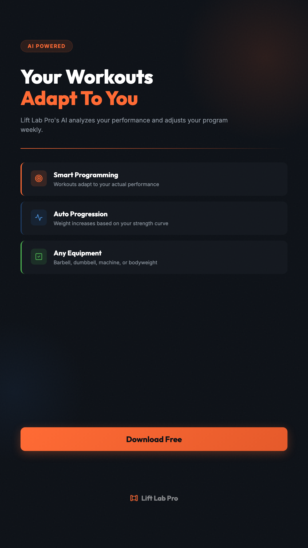 Your AI coach adapts your program every week based on your actual performance. Stop following cookie-cutter programs. #LiftLabPro #AIFitness #WorkoutApp
