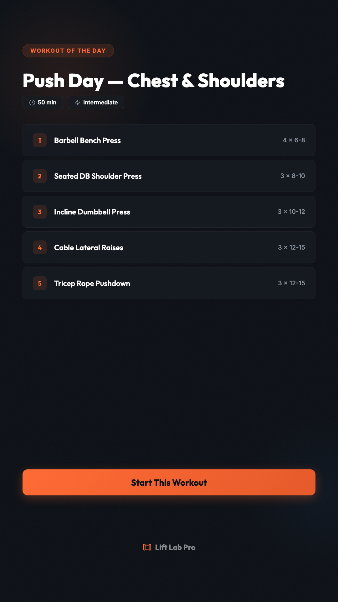 Push day. Hit these five movements and you've covered chest, shoulders, and triceps in 50 minutes. #LiftLabPro #PushDay #WorkoutOfTheDay