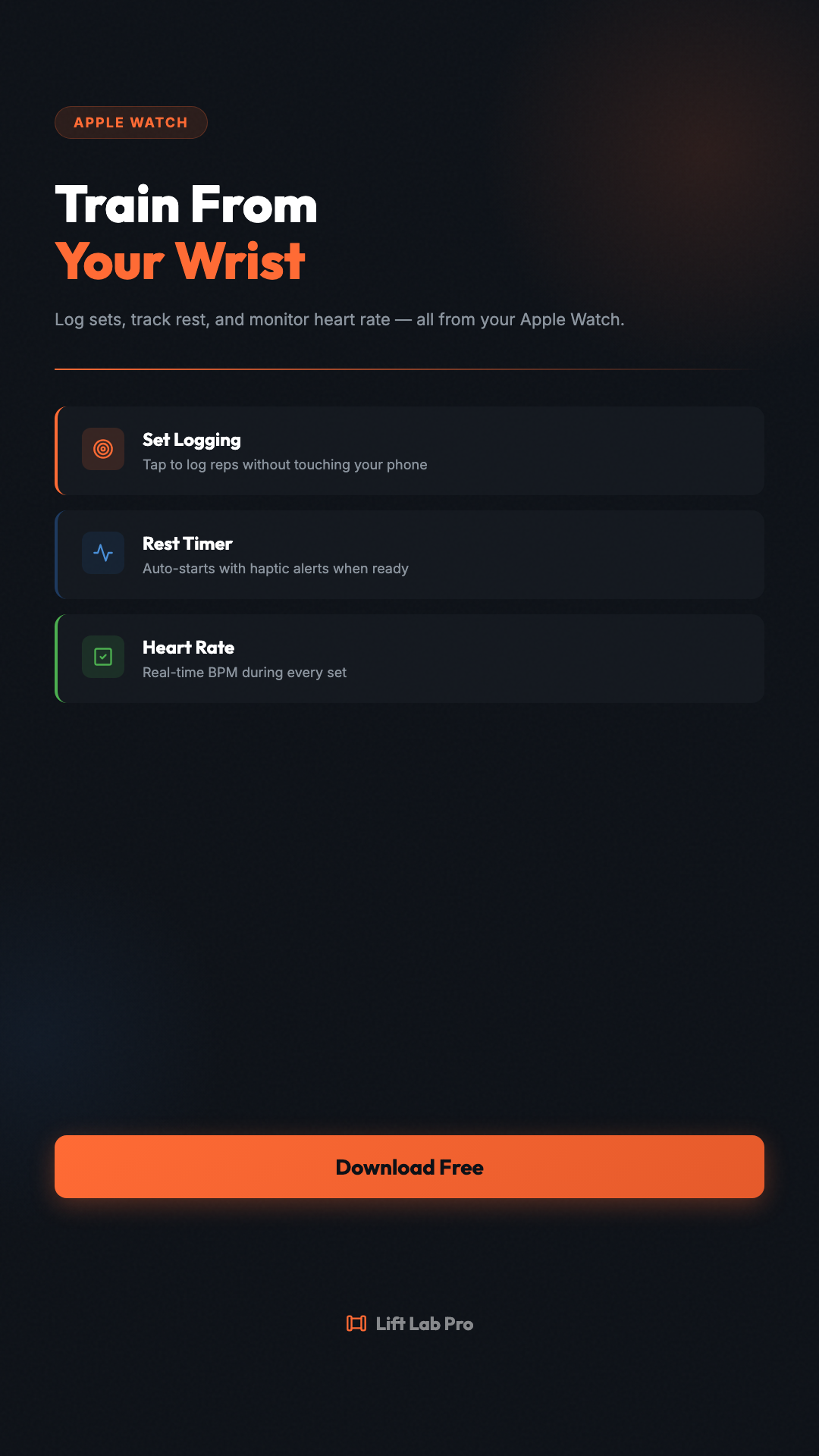Log sets from your wrist. Rest timer with haptic alerts. Heart rate during lifts. All without touching your phone. #LiftLabPro #AppleWatch #FitnessTech #WearableFitness