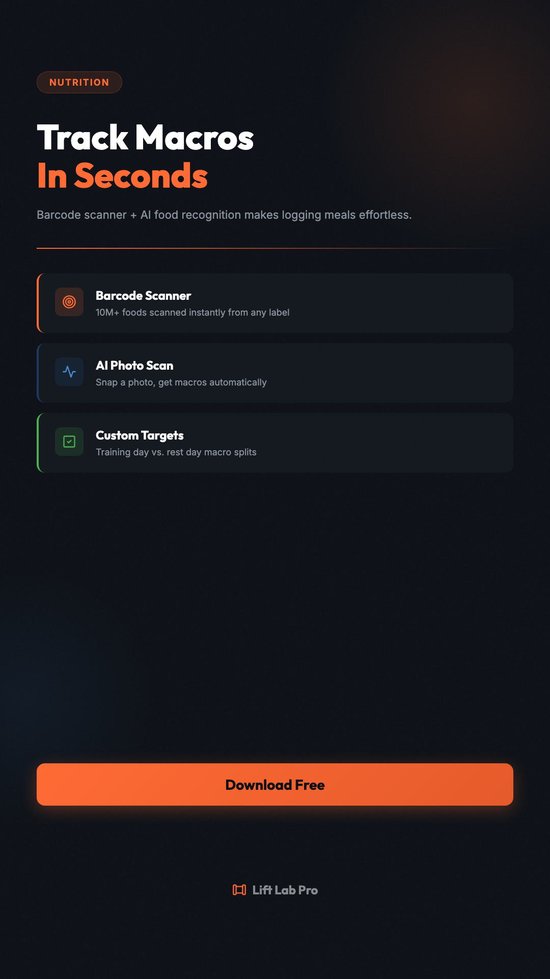Barcode scanner, AI photo recognition, and 10M+ foods. Nutrition tracking that takes seconds, not minutes. #LiftLabPro #NutritionTracking #MacroTracking #FitnessApp