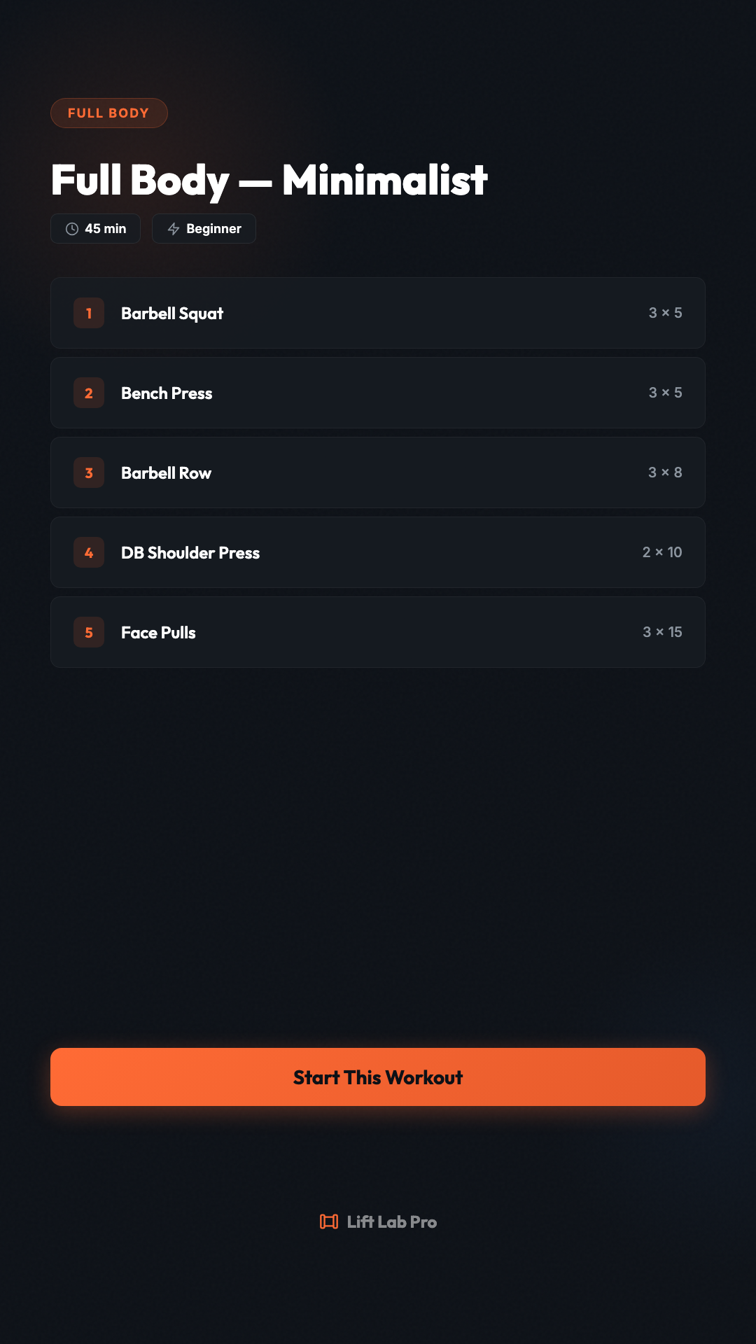 Full body in 45 minutes. Squat, press, row, accessory. Three times a week. #LiftLabPro #FullBody #WorkoutOfTheDay #MinimalistTraining